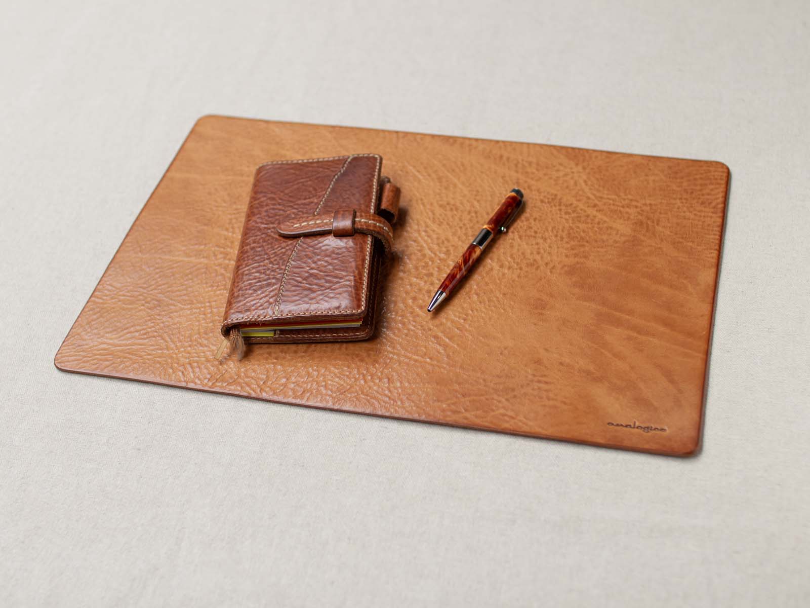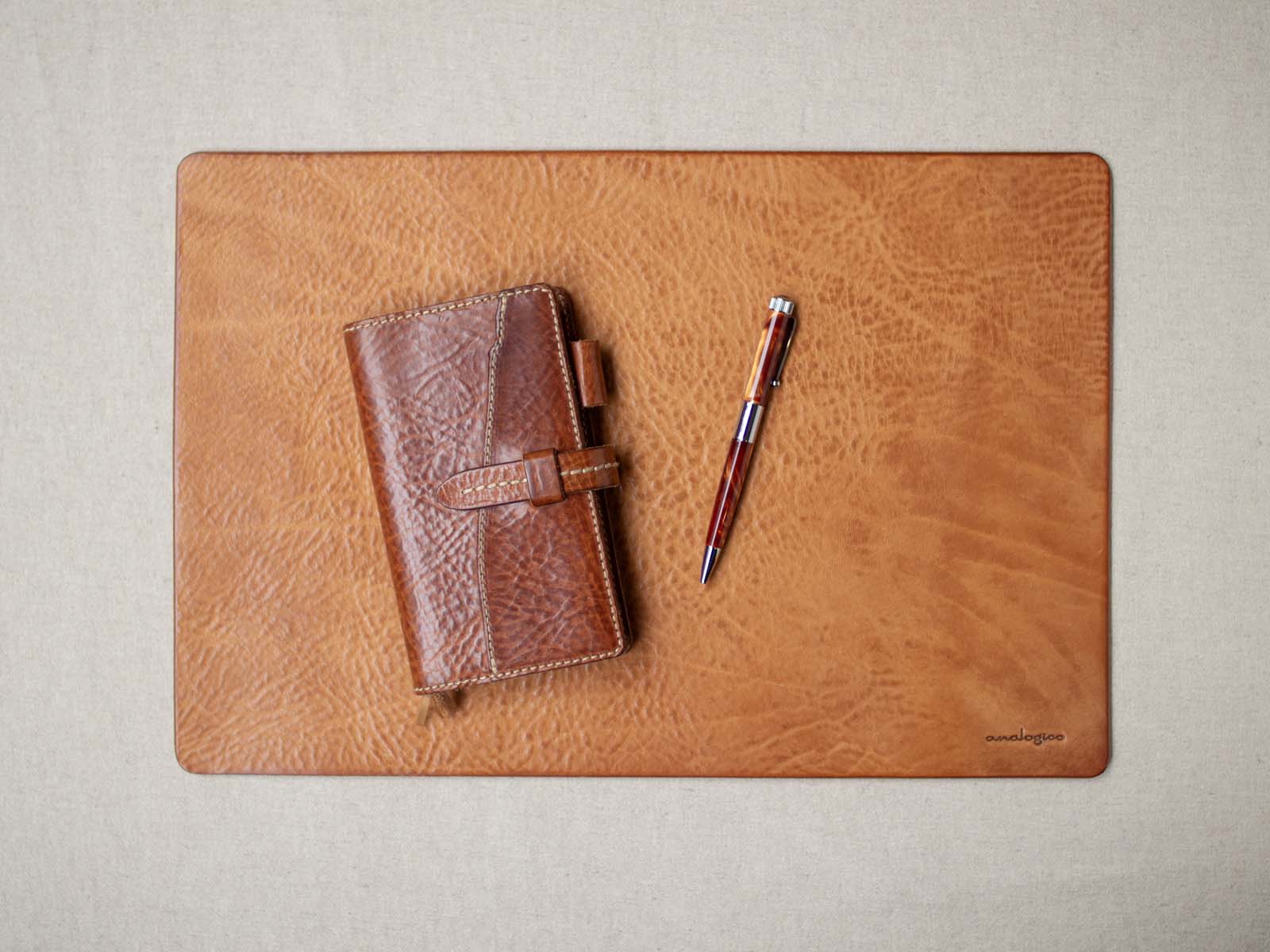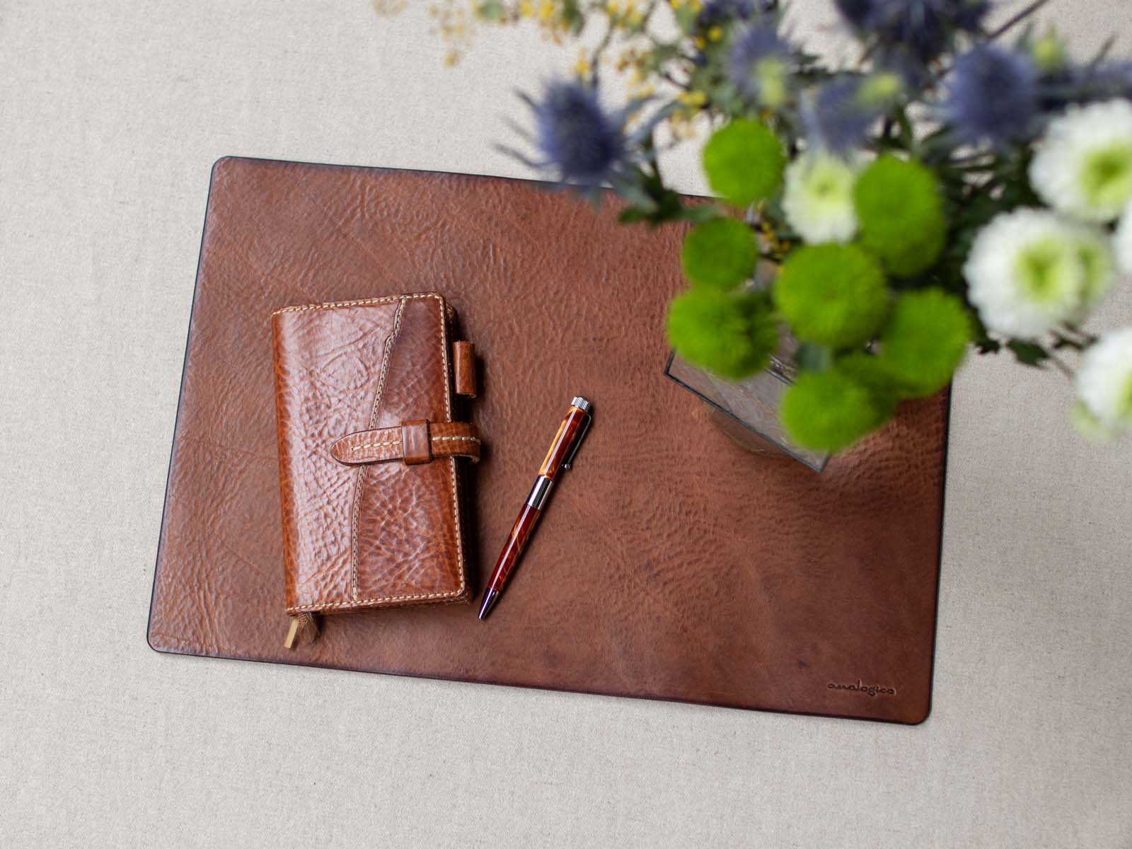 仕事中の気分を上げてくれるレザーのデスクマット。デスク周りにお気に入りのレザーアイテムを並べて、心地よい香りに包まれれば仕事も捗りそうです。