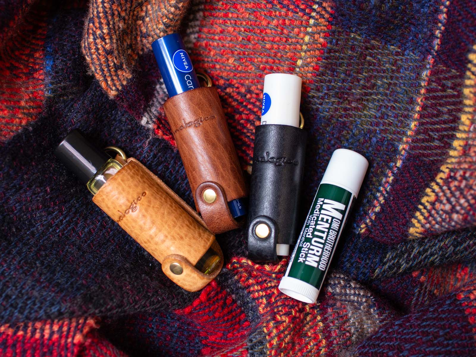 メンソレータムよりも細身のリップも端革で自由に調整が効くため、好きなリップを入れ替えて使えます。