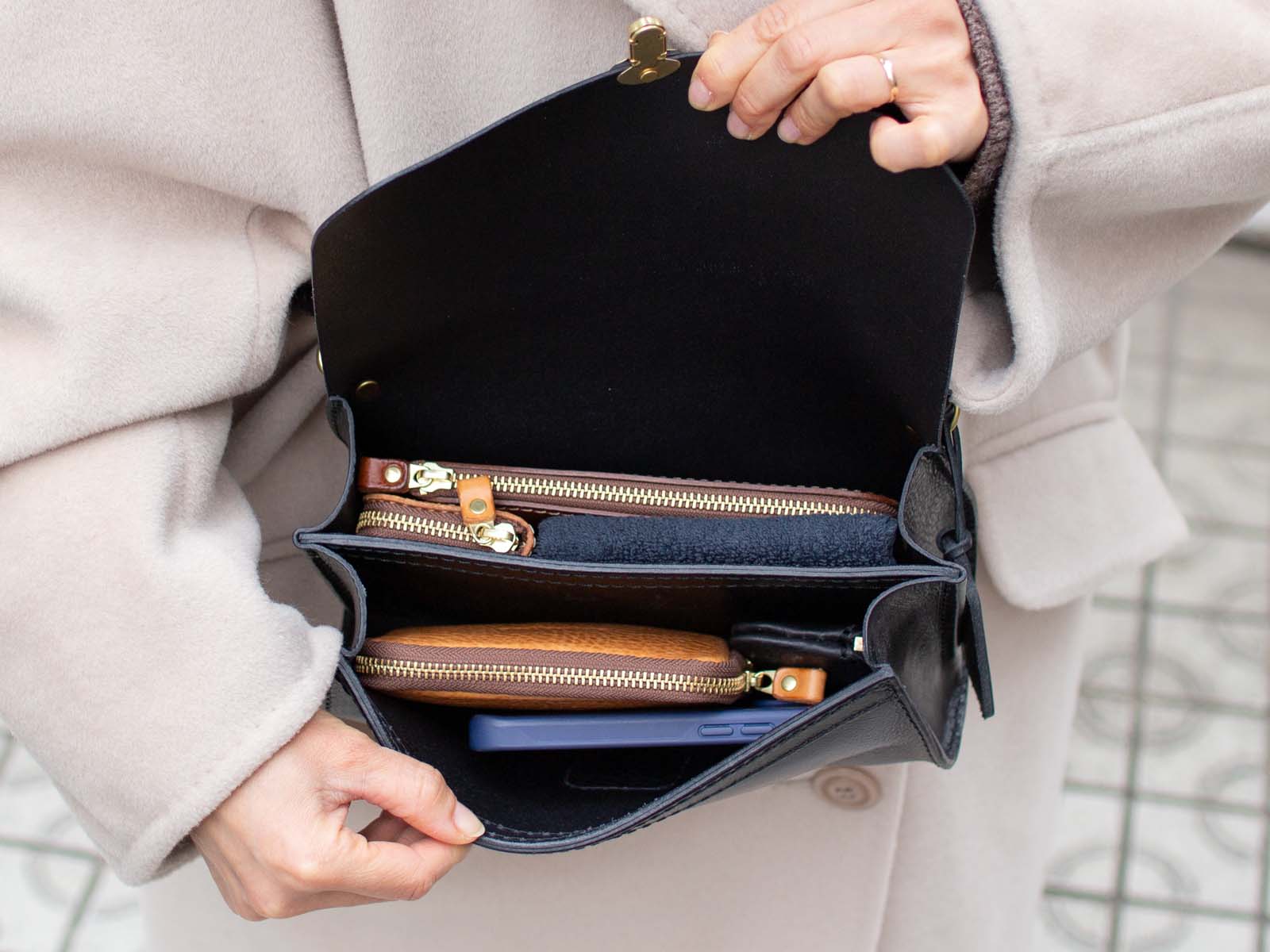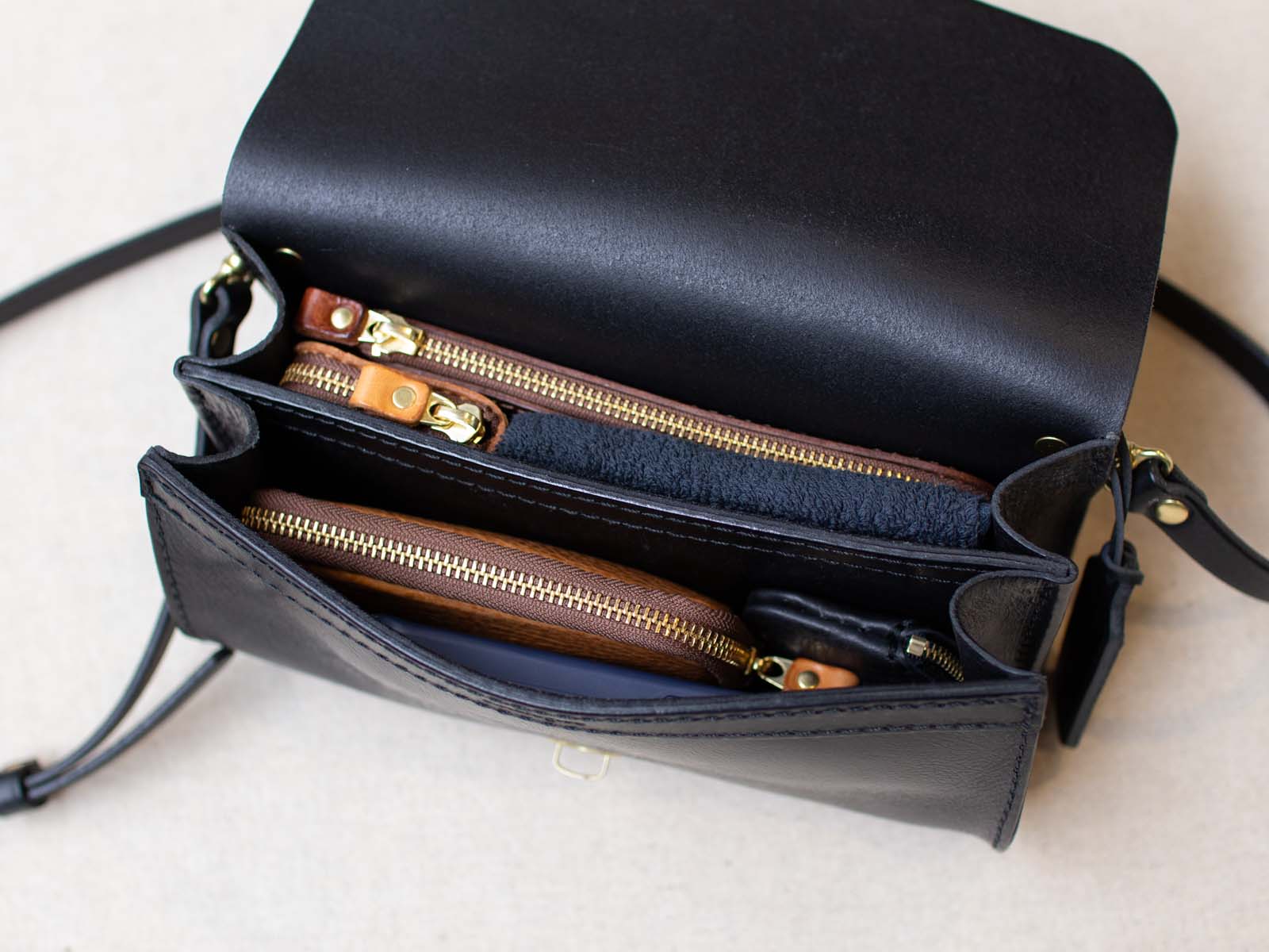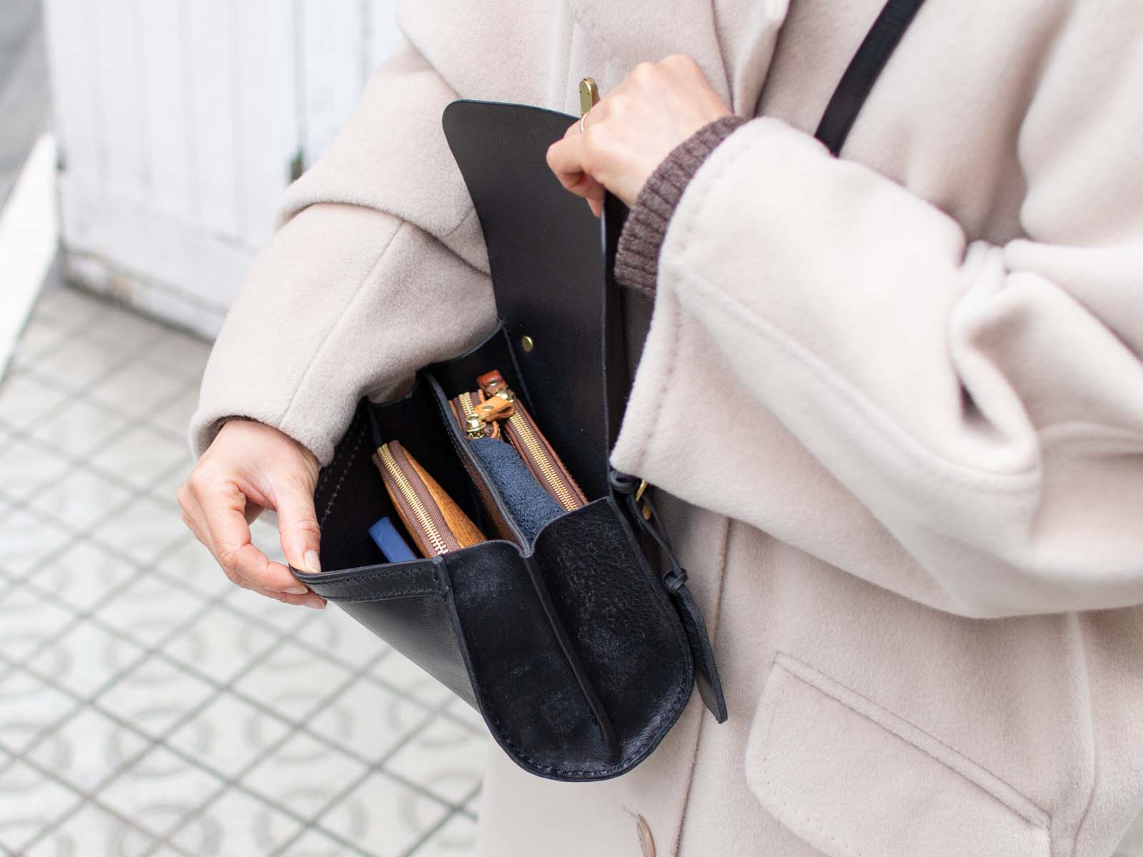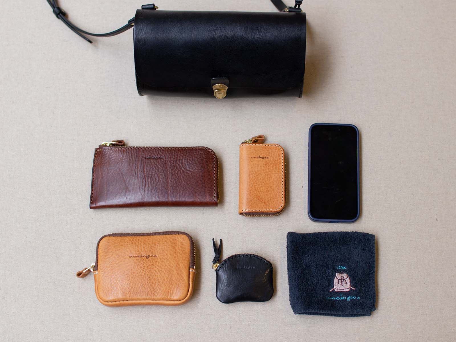 収納例:L字ファスナー長財布、ラウンドファスナーキーケース、スマートフォン、角刈りポーチ、ファスナーコインケース、タオル