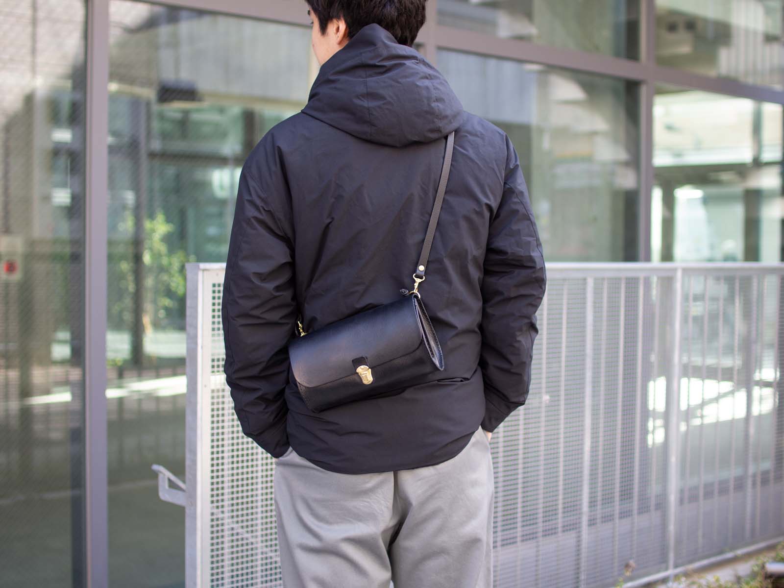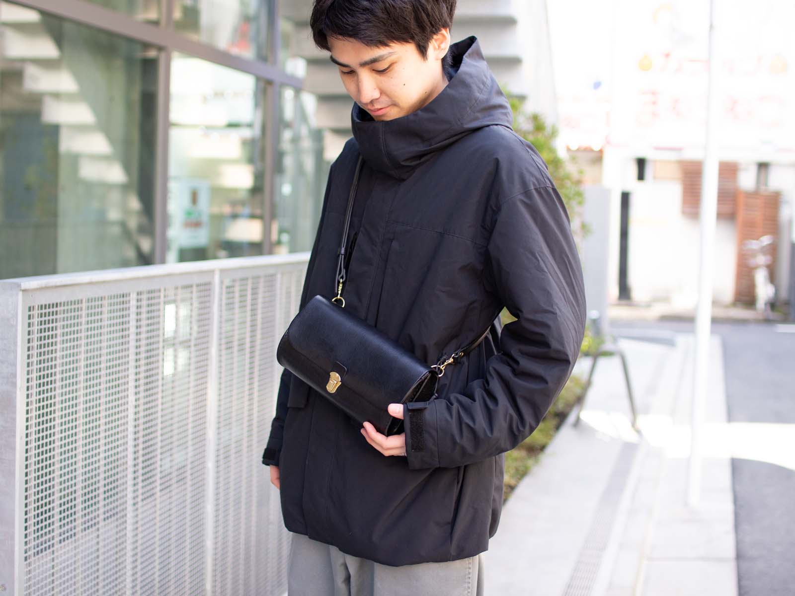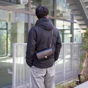 (ショルダー最短)差込錠のカチッとしたデザインがポイントです。男性のお客様もぜひ会場でお試しください。
