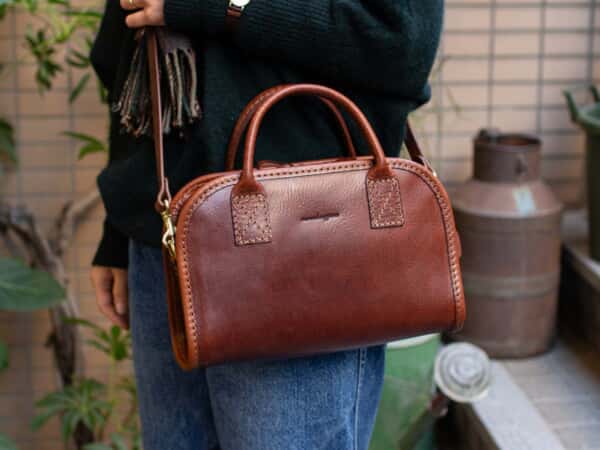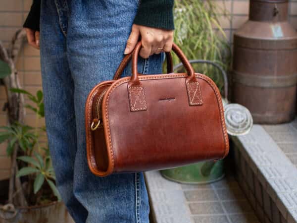 上底マチという、外縫いと内縫いを組み合わせた構造に、前後面にかけてヘリ巻きを施しており、丸みがあるフォルムでありながらカチッとした印象に仕上げられています。
