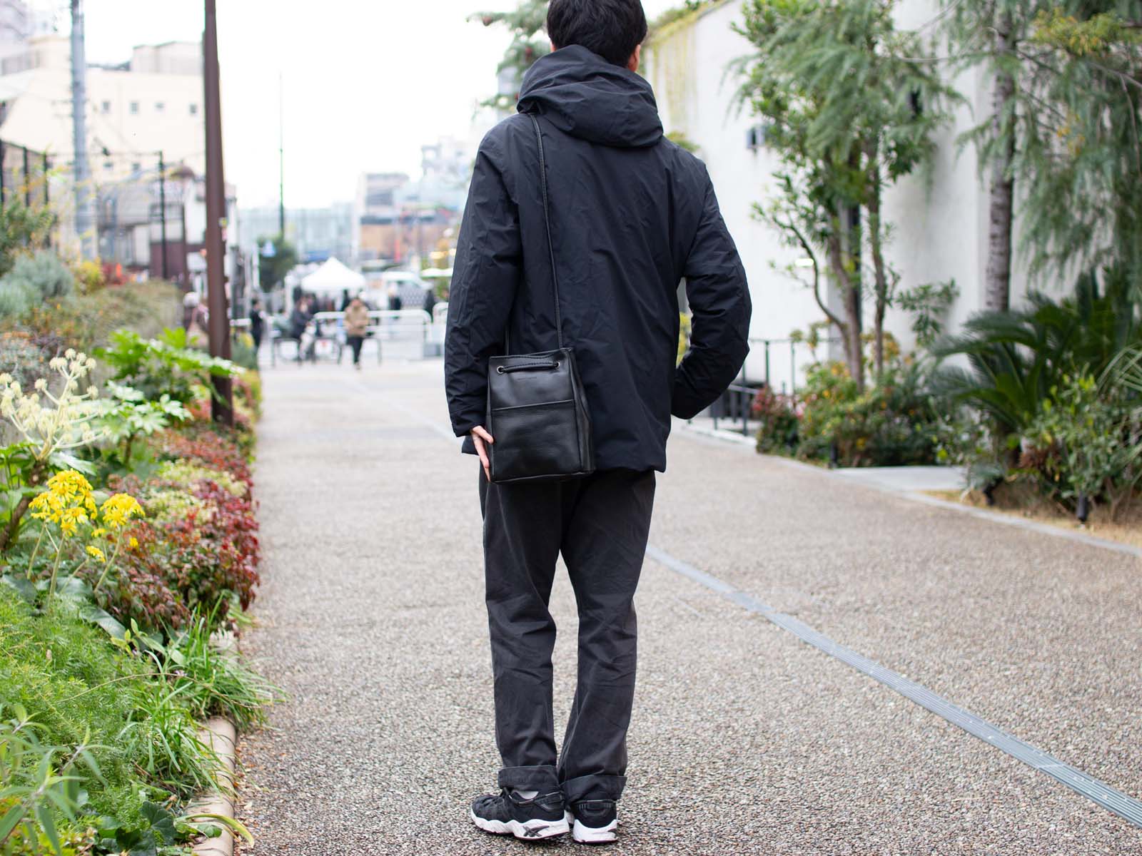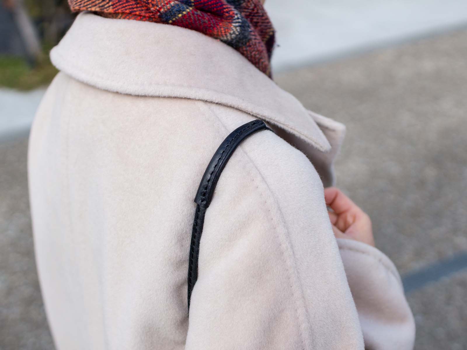 ショルダーとして肩に掛けた時に、革を巻いた箇所が肩に当たるようになっています。