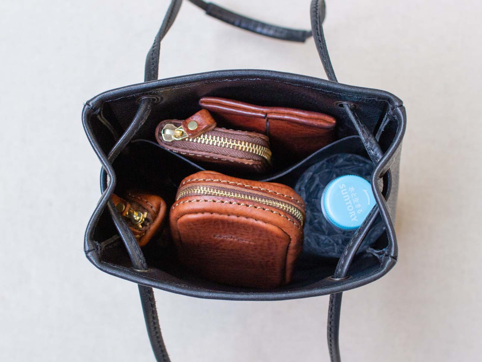 収納例:スティックペンケース、カシメミニ財布、ファスナーコインケース、スマートフォン、500mlペットボトル、ポケットティッシュケース、ラウンドファスナーキーケース、ロゼットポーチ、ハンカチ