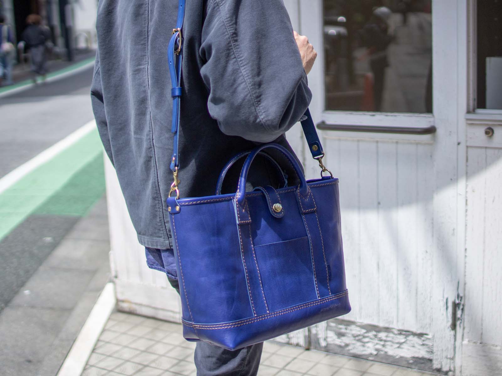 本体の大きさはグランデトートと同じですが、ドイツホックの留め具があり、持ち手は短めで、着脱可能なショルダーストラップが付いています。定番品にはない一点物のデザインに仕上げています。価格:¥74,800